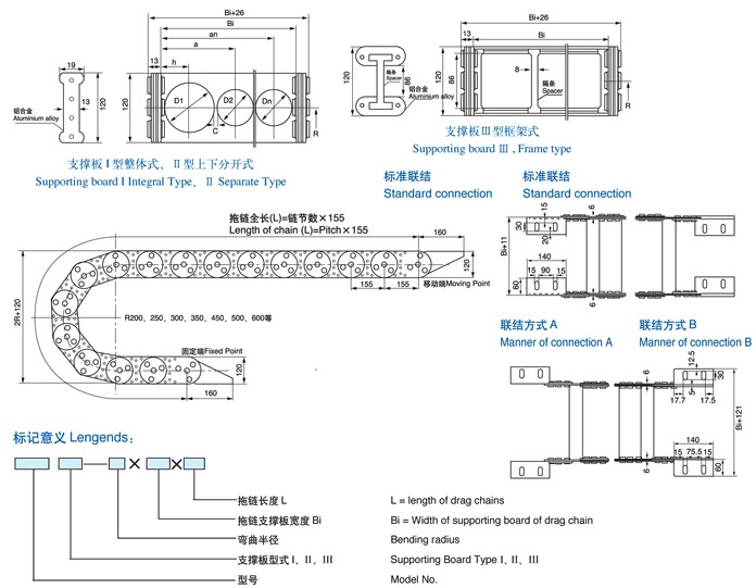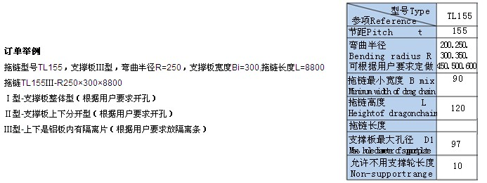 TL155型鋼制拖鏈按結構可分為TL型鋼制拖鏈和TLG型鋼制拖鏈,鋼制拖鏈按節(jié)距分類有45、65、75、95、100、125、180、225、250型。拖鏈寬度可按用戶要求定做,彎曲半徑從50-800之間。有三種支撐板的形式。(1)當拖鏈需承載較大管、纜負荷時、應選用高強度支撐板——整塊式(2)當管纜的管接頭尺寸大于支撐板內腔孔徑或須經常拆裝、維修等時??蛇x用支撐板——分開式(3)安裝管纜的規(guī)格品種較多時,可選用支撐板——框架式。