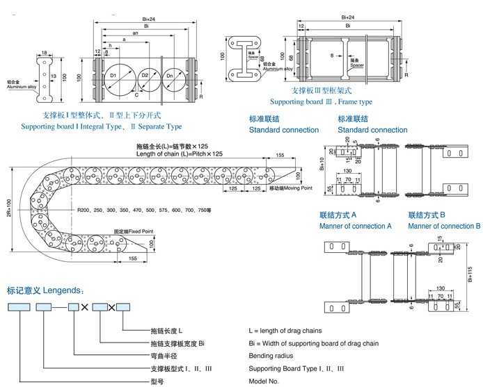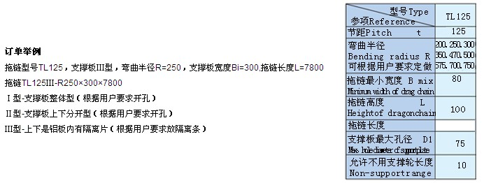 TL125型鋼制拖鏈按結構可分為TL型鋼制拖鏈和TLG型鋼制拖鏈,鋼制拖鏈按節(jié)距分類有45、65、75、95、100、125、180、225、250型。拖鏈寬度可按用戶要求定做,彎曲半徑從50-800之間。有三種支撐板的形式。(1)當拖鏈需承載較大管、纜負荷時、應選用高強度支撐板——整塊式(2)當管纜的管接頭尺寸大于支撐板內(nèi)腔孔徑或須經(jīng)常拆裝、維修等時??蛇x用支撐板——分開式(3)安裝管纜的規(guī)格品種較多時,可選用支撐板——框架式。