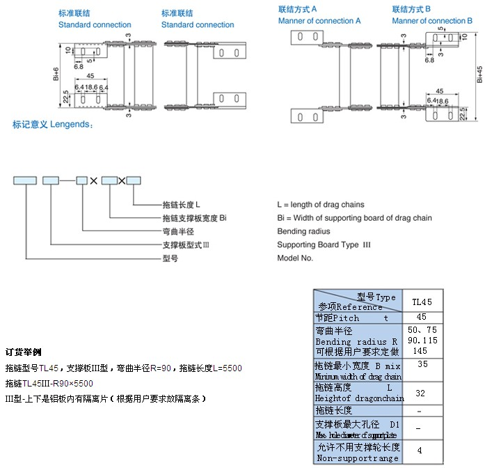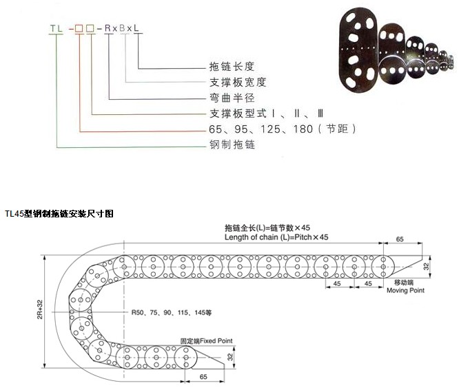 TL45型鋼制拖鏈按結(jié)構(gòu)可分為TL型鋼制拖鏈和TLG型鋼制拖鏈,鋼制拖鏈按節(jié)距分類有45、65、75、95、100、125、180、225、250型。拖鏈寬度可按用戶要求定做,彎曲半徑從50-800之間。有三種支撐板的形式。(1)當拖鏈需承載較大管、纜負荷時、應(yīng)選用高強度支撐板——整塊式(2)當管纜的管接頭尺寸大于支撐板內(nèi)腔孔徑或須經(jīng)常拆裝、維修等時。可選用支撐板——分開式(3)安裝管纜的規(guī)格品種較多時,可選用支撐板——框架式。
